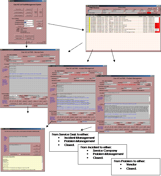 To adhere to ITIL best practises, and to facilitate the handling of all faults in one system, the FMS has been designed with separate modules, that allow relationships and fault handling, as well as particular screen and database differences for specific process focussed roles.